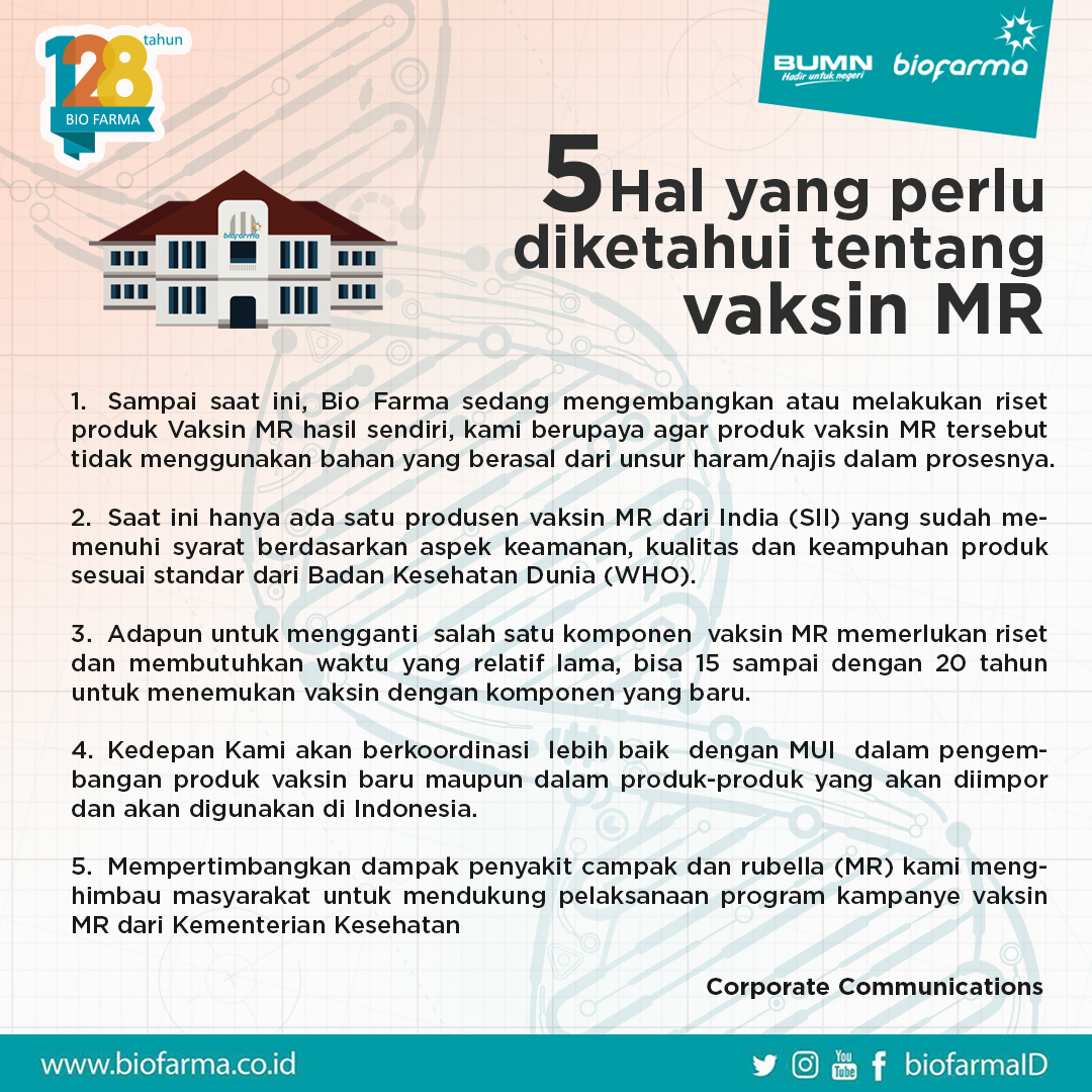 5 HAL PENTING MENGENAI VAKSIN MR Jumat, 8 Januari 2021 Berikut 5 hal yang perlu kita ketahui mengenai Vaksin Measles Rubella (MR) Bagikan: Download