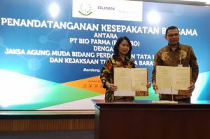 Jaksa Agung Muda Bidang Perdata dan Tata Usaha Negara (JAMDATUN) Loeke Larasati Agoestina menandatangani nota kesepahaman dengan Direktur Utama Bio Farma M Rahman Roestan, serta Kejaksaan Tinggi Jawa Barat (KEJATI), Raja Nafrizal yang diwakili oleh Imanuel Zebua (Asisten Bidang Perdata dan Tata Usaha Negara) menandatangani kesepakatan dengan Direktur SDM da Umum Bio Farma, Disril Revolin Putra di Bandung, Jumat (23/3).