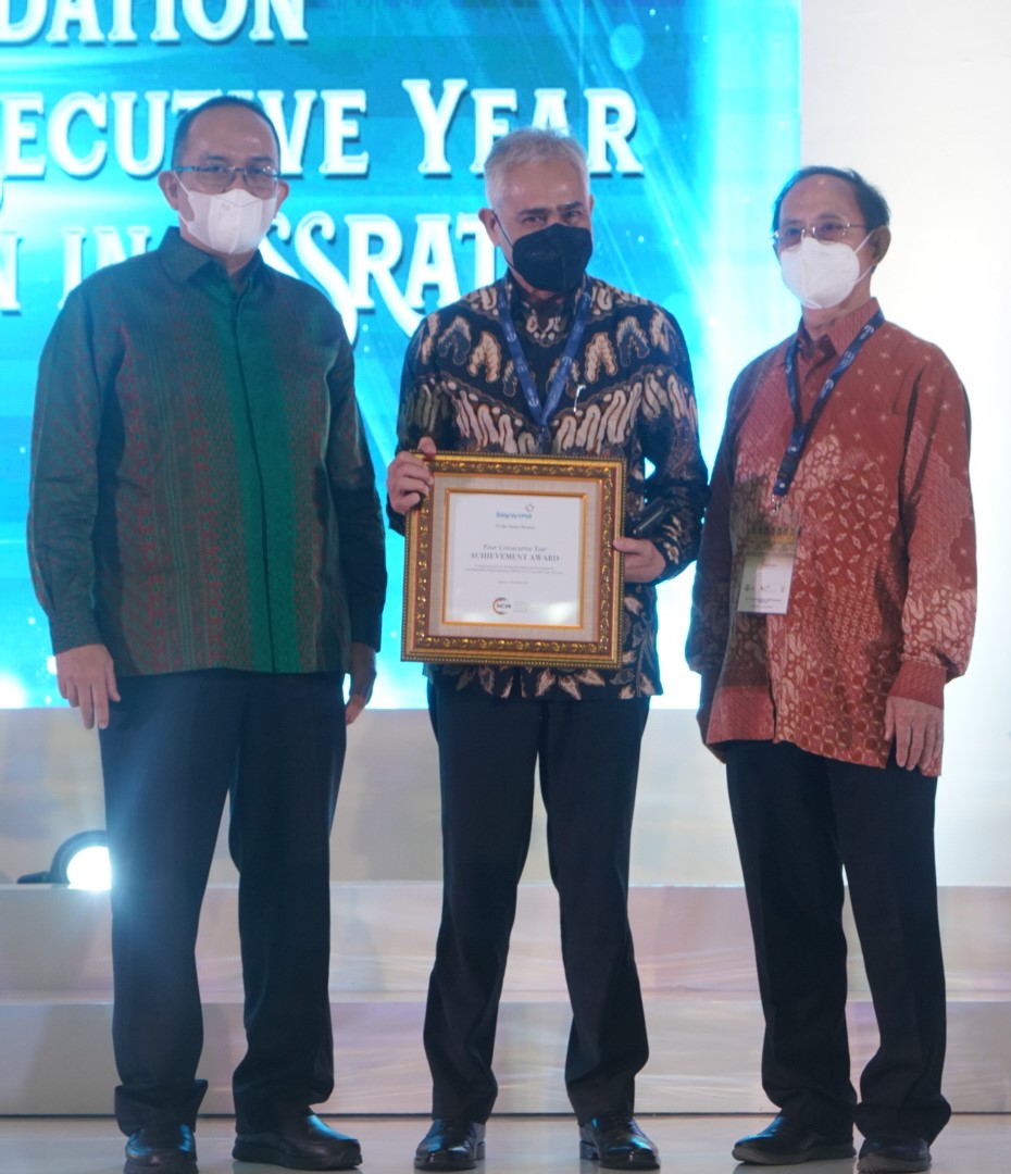Disril Revolin Putra, SEVP Legal and Compliance (tengah) menerima plakat penghargaan Commendation for Four Consecutive Year Participation in ASSRAT dalam ajang pemeringkatan laporan keberlanjutan tingkat Asia (ASRRAT) 2021 didampingi Franky Jamin, Board NCSR (Kanan) dan Chairul Djakman, Anggota juri & Board NCSR (kiri)