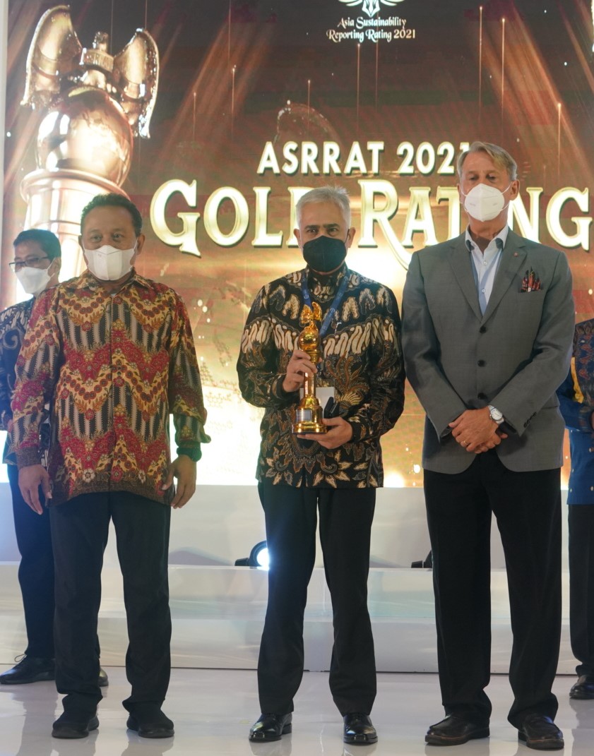 Disril Revolin Putra, SEVP Legal and Compliance (tengah) menerima piagam Gold Rank dalam ajang pemeringkatan laporan keberlanjutan tingkat Asia (ASRRAT) 2021 didampingi Alistair, Speirs “ Chairman of most value business (kanan) dan Eko Ganis, Ketua juri & Direktur ICSP (kiri)