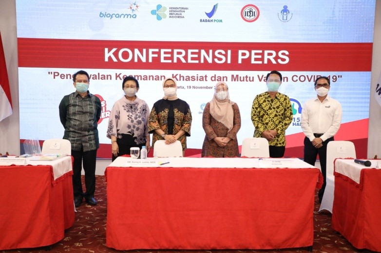 (kiri –kanan) ; Ketua Komnas KIPI, Hindra Irawan Satari, Ketua Indonesia Technical Advisory Group on Immunization (ITAGI) Dr. Sri Rezeki Hadinegoro, Kepala Badan POM, Penny K Lukito, Kepala Pustlitbang Biomedis dan Teknologi Dasar Kesehatan, Dr. dr. Vivi Setiawati, Ketua Ikatan Dokter Indonesia (IDI), Daeng M. Faqih dan Direktur Utama Bio Farma, Honesti Basyir. Dalam kegiatan konferensi pers bersama ddengan tema Pengawalan Keamanan, Khasiat dan Mutu Vaksin Covid-19 di Jakarta pada 19 November 2020 |