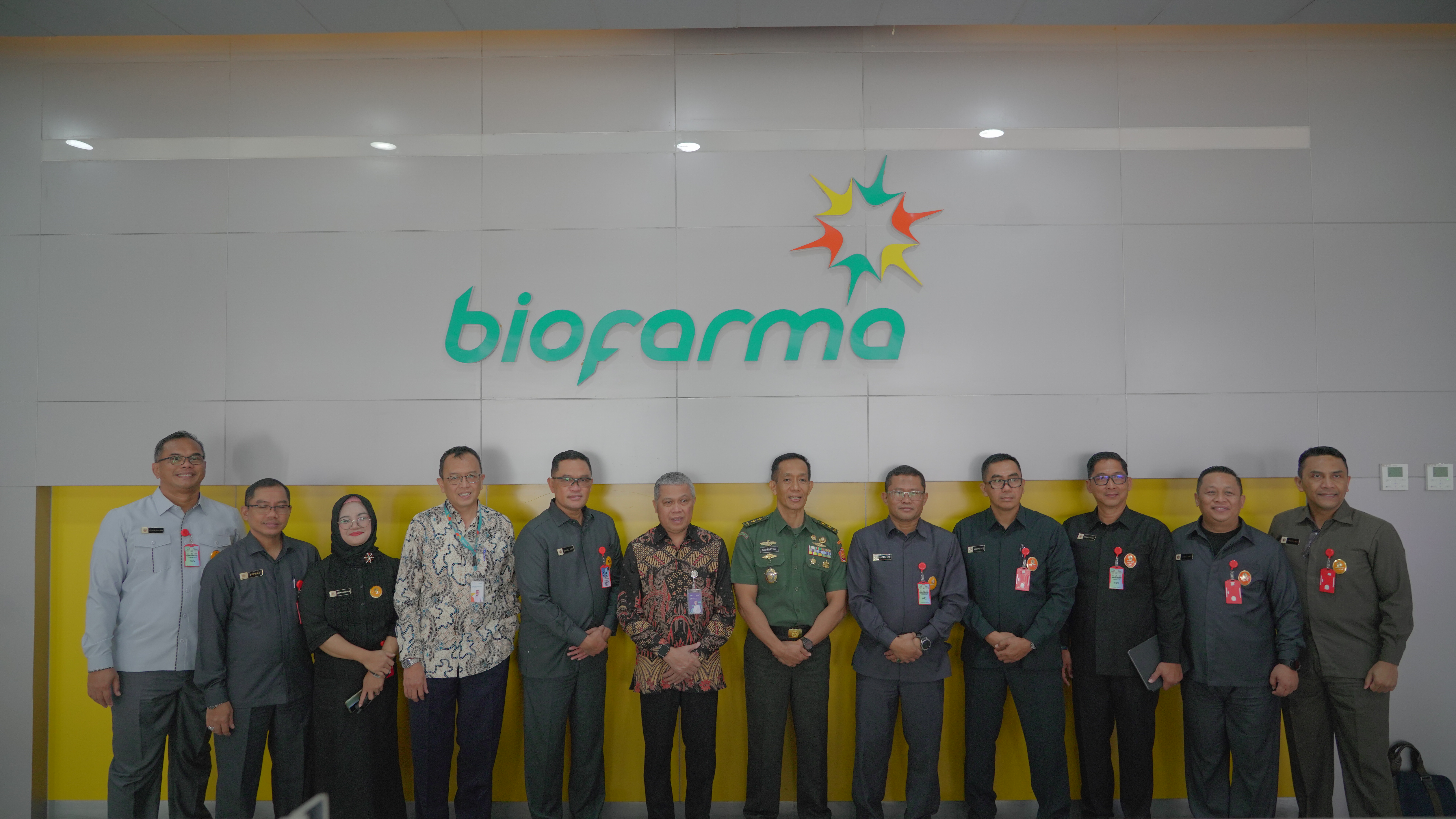 Tenaga Ahli Pengkaji Bidang Kepemimpinan Mayjen TNI Supriyatna (ke-6 dari kanan) saat sedang melakukan kunjungan pada salah satu fasilitas produksi Bio Farma didampingi oleh Komisaris Utama Bio Farma, Tugas Ratmono (ke-6 dari kiri).