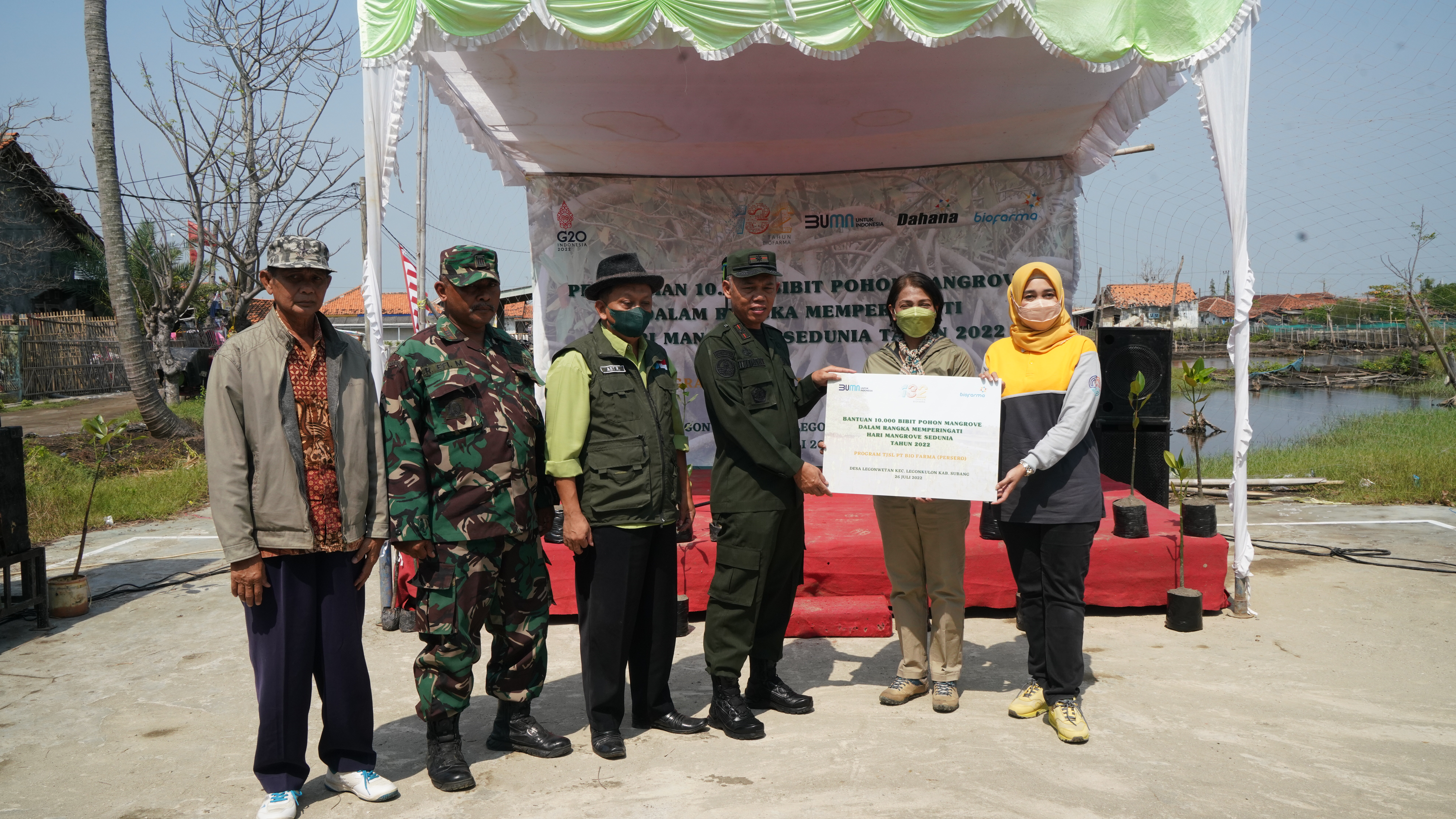Kepala Divisi Tanggung Jawab Sosial dan Lingkungan Bio Farma & Plt Kepala Divisi Human Capital Service Tjut Vina Irvianti (kedua dari kanan), didampingi Oleh Ketua Umum Forum Istri Anggota Holding Farmasi (FIADIFA) Ita Honesti (kanan) secara simbolis menyerahkan 10 ribu bibit Bibit Pohon Mangrove, kepada Kepala Dinas Lingkungan Hidup Kabupaten Subang H. Hidayat (ketiga dari kiri). Kegiatan penanaman 10 ribu bibit Bibit Pohon Mangrove ini, dilaksanakan di tiga desa yaitu Desa Mayangan, Desa Legonwetan dan Desa Tegal Urung, dengan total luas lahan 10 hektar
