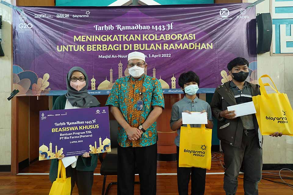 Direktur Operasi Bio Farma, M. Rahman Roestan, memberikan santunan Beasiswa Khusus Program Bantuan TJSL, pada kegiatan Tarhib Ramadhan 1443 H : Meningkatkan Kolaborasi Untuk Berbagi Di Bulan Ramadhan, pada tanggal 1 April 2022.