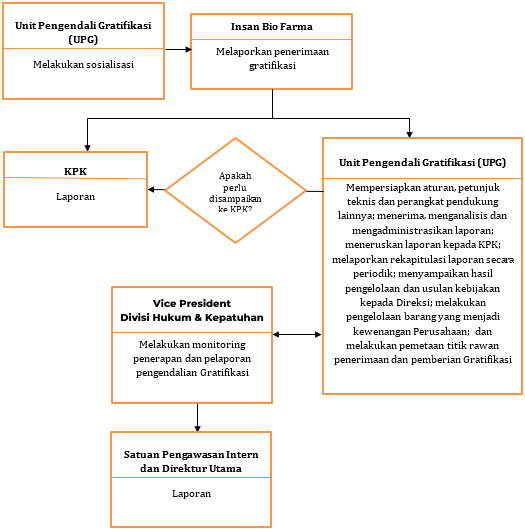 Insan Bio Farma menjunjung tinggi kejujuran, transparansi, dan kepercayaan sesuai dengan nilai Perusahaan, yaitu integritas. Hal ini dibuktikan dengan adanya sistem pengendalian gratifikasi yang dibuat oleh Perusahaan untuk menghindari Insan Bio Farma dari tindakan korupsi, kolusi, dan nepotisme (KKN). Selain itu, terdapat aplikasi Gratifikasi untuk memudahkan Insan Bio Farma untuk melaporkan penerimaan yang diduga gratifikasi kepada Unit Pengendali Gratifikasi (UPG) yang ditunjuk untuk memantau proses pengendalian gratifikasi.
